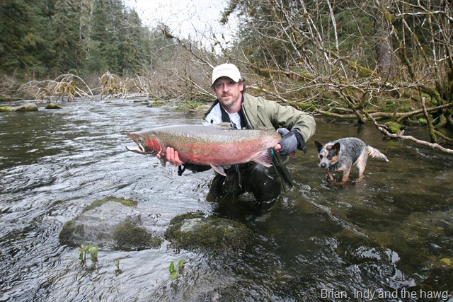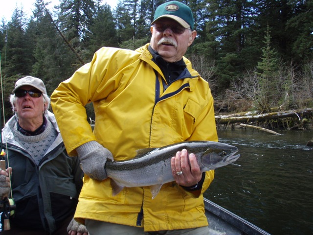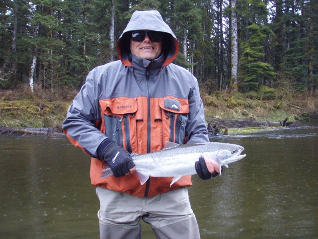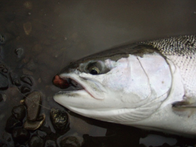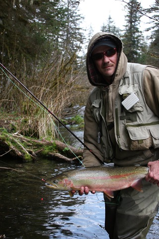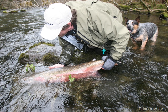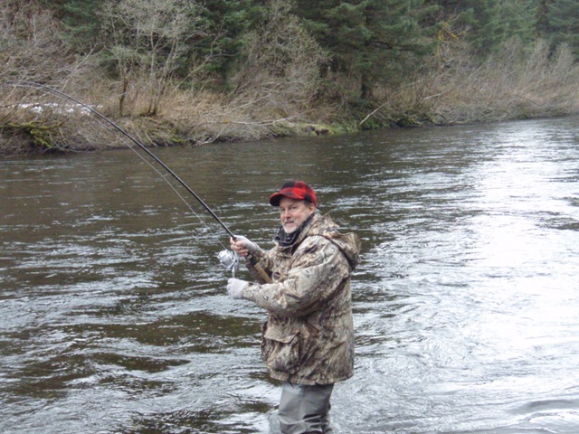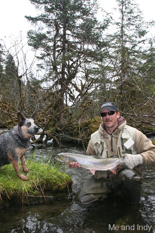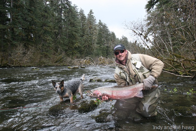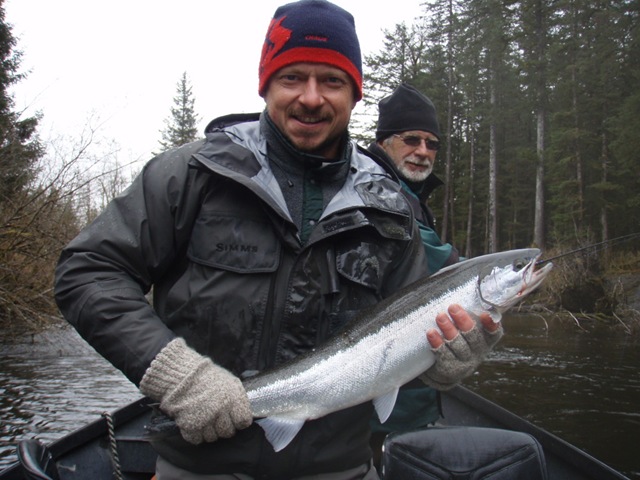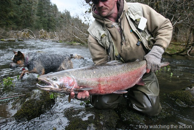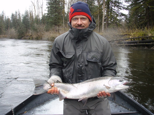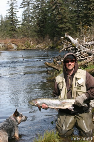 Sorry about the font, my program keeps giving script errors. Well the sockeye will be here soon, but there are a bunch of Steelhead still in the river. On the 14th of June, commercial nets go into the river. Cross your fingers that the Steelhead are gone by then. There are a small percentage of Steelhead that get caught in the nets each season, but the percent is small enough, that there is virtually no impact on the run itself. I can smell the Salmon in the air. They are close, but I still can’t get out of Steelhead mode. Steelhead are the best fresh water fish there is, and I wish they would run all year long. This will be the last Steelhead post of the season, or until I get back to Oregon for the winter. I hope the Salmon season goes well, and I will continue to post nearly every day throughout the entire year. I don’t take as many pictures during Salmon season normally, as I do with the Steelhead, so if I am slacking on pics then let me know. I will also be tracking down the Yakutat Lodge Hooker fleet of boats, to get pics of the butts, cod, and kings. Hopefully during this time I can give some good info and how to catch Steelhead, and some of the methods I have used for the last 20 years. Here are some pics from the last of the Steelhead with my photographer.