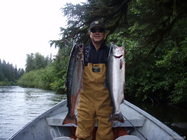 Well it has been 7 years since I have seen the sun shine in Oregon, in the summer. Damn it’s hot!!!. I know 70 and 80 degrees is not that warm, but from what I am used to, this is hot. Anyway, I am home on vacation now, and having a great time. The creek that I have been fishing for the last 30 years, for winter Steelhead, has Chinook returning to it for the first time in 20 years. When I was 18, I can remember days on the creek, where you could catch ten to twenty of these big kings per day. Then back in the mid to late 80’s, because of lack of funding, the kings run was shut down at the hatchery, resulting in the decline and eventually the end of the Chinook to Eagle Creek. I am glad to say that 6 years ago the state funded a private hatch box, and this is the first returns to the creek this year. It is not a coincidence that I am home at this time. I did not want to miss the first year the Kings came back. I called ahead to some of my friends before I returned, just to see if there were any kings in the creek. The reports I got were not good, but I had a gut feeling that they were there, and my friends had just not spent the time to really look. Well I am glad to say that in the 3 days I have fished, since my return, the fishing has been great, and the Kings I have found have been in great shape. I have got into about 20 fish, and landed about half of them. The biggest so far, being about 25 pounds. These fish have just a bit of color, but they still have white belly’s, and the meat is still bright orange, and they are very firm, and full of fight.