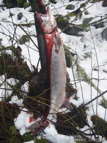 Silver Bullets are starting to show in the upper creek now. I have seen a slow rise in the number of fish on a daily basis. My hook up ratio to fish spotted has been almost 100%, but the landing ratio has needed a little help. I have been able to hook up with 22 fish in the last 4 days, but only four have come to the camera lens to get a pic. I am hoping that the fishing this year will be getting better on a daily basis. The fish are not to big yet, and the early ones that have been in the system for awhile do have a little color showing up on them. They still have all there fight though. I was into about a twenty pound female yesterday, that taught me the meaning of power. She tore me up and then spit me out at the last possible second, after a half mile run down river. When I finally caught up to this fish, she turned, looked at me, and promptly spit my hook back into my face. Oh well I will get her tomorrow.