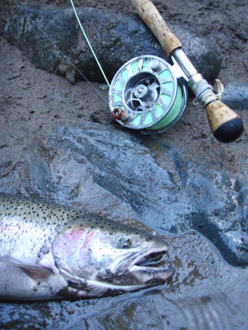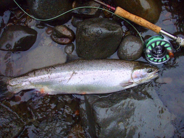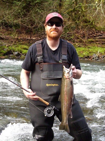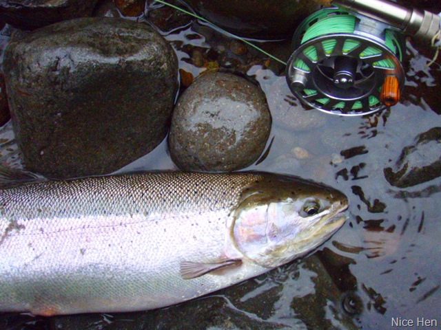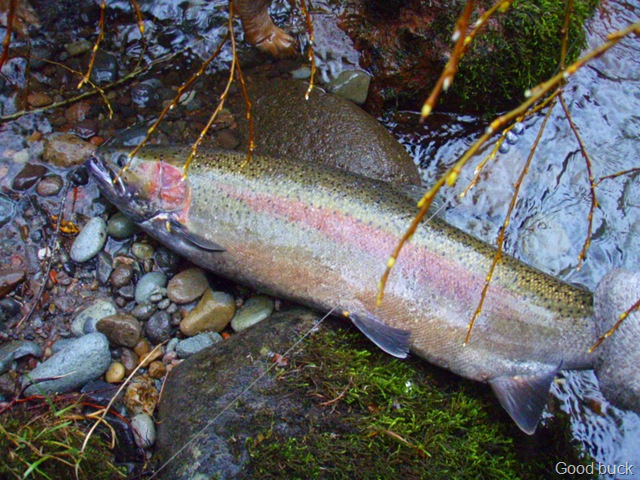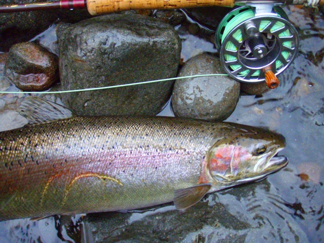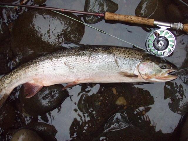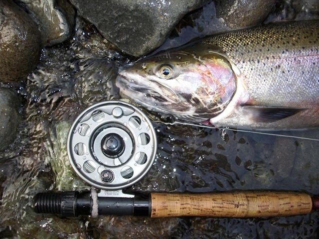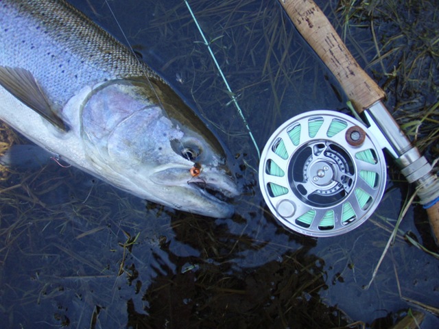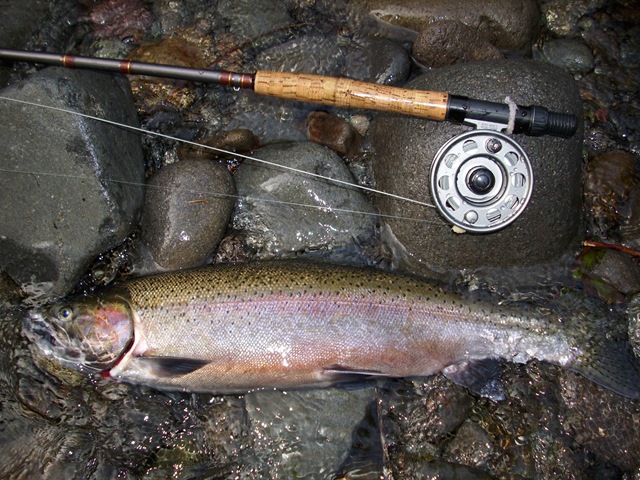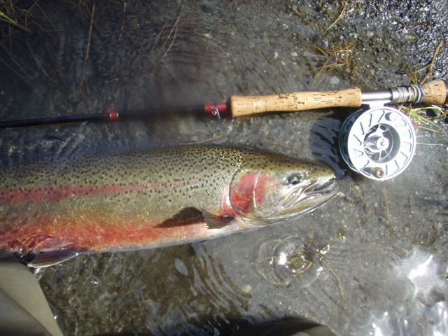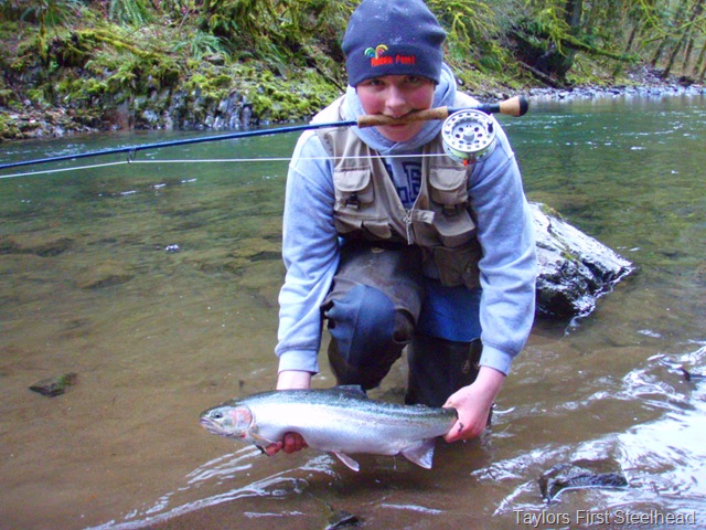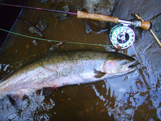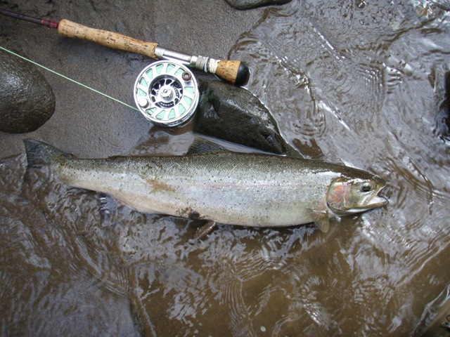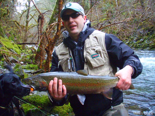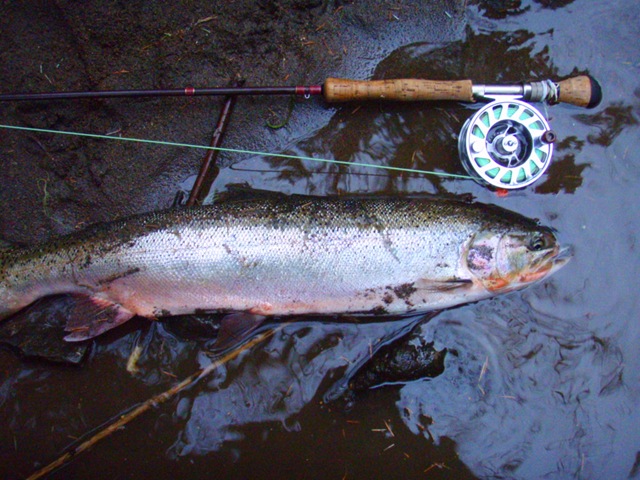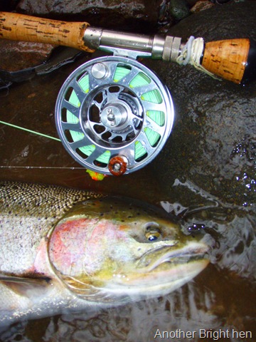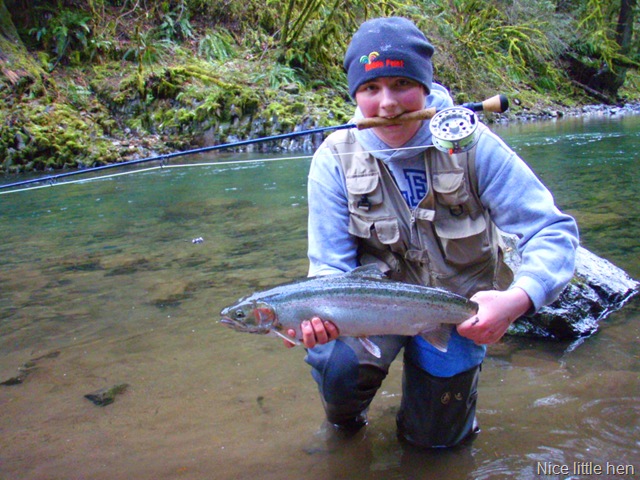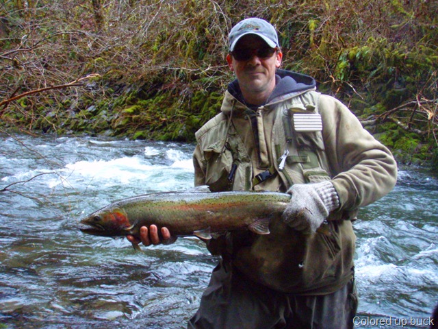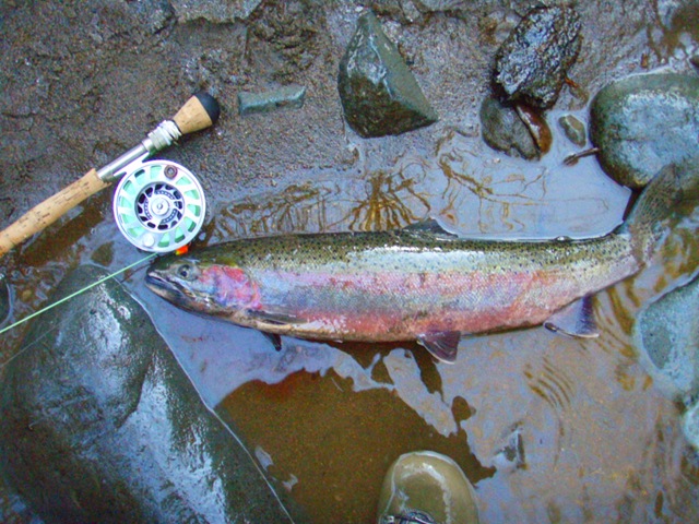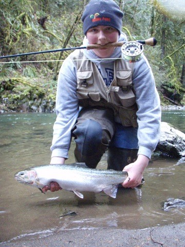 Well the lake fishing went to the wind real quick. I was able to get in the water on Saturday morning, and get into 5 fish, (All Bows). Then the wind kicked up, and blew us off the lake. That was it for me! I knew there were Steelhead in Oregon, and I wanted to get back to them. So today, I was on the creek nice and early. First cast of the day was nice little hen. Not more than ten minutes later, another nice little hen. I was able to get into another 7 fish, and land 2 more. It was not to bad, but I am hoping this week will get real good. Also congratulations to Taylor, for getting his first Steelhead on a fly rod today, it was a real nice fight, and a real nice first fish. Here are the pics from today.