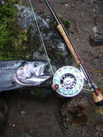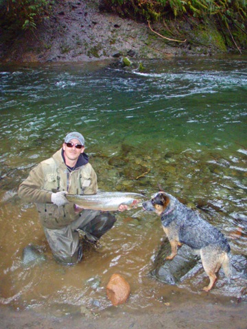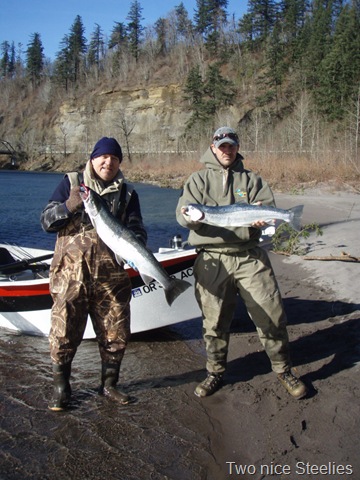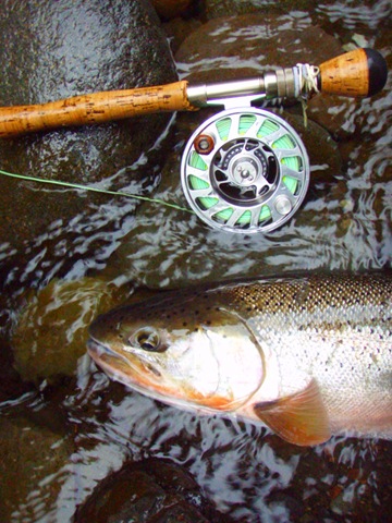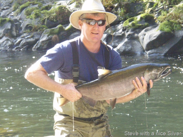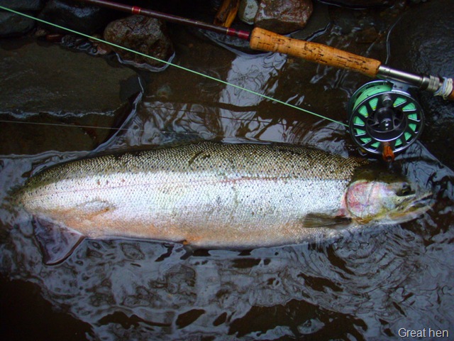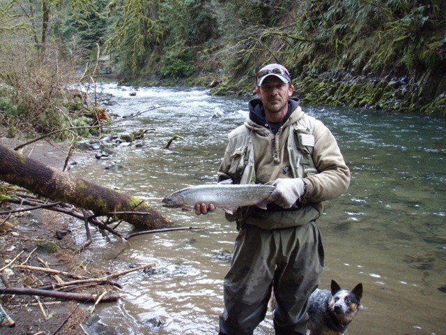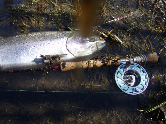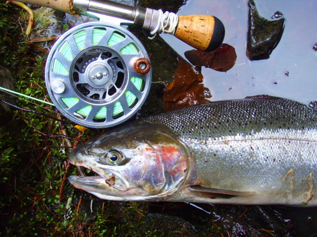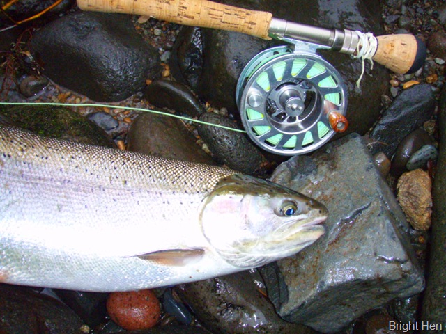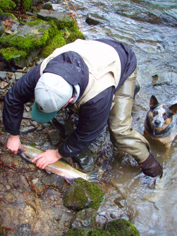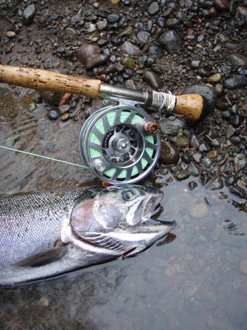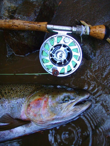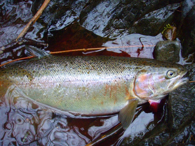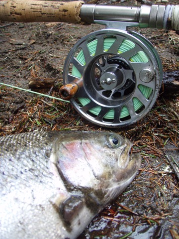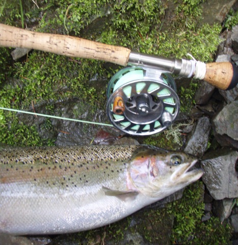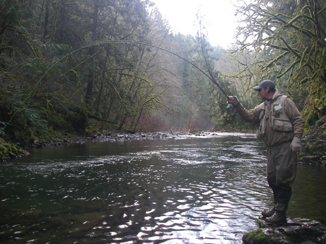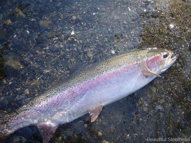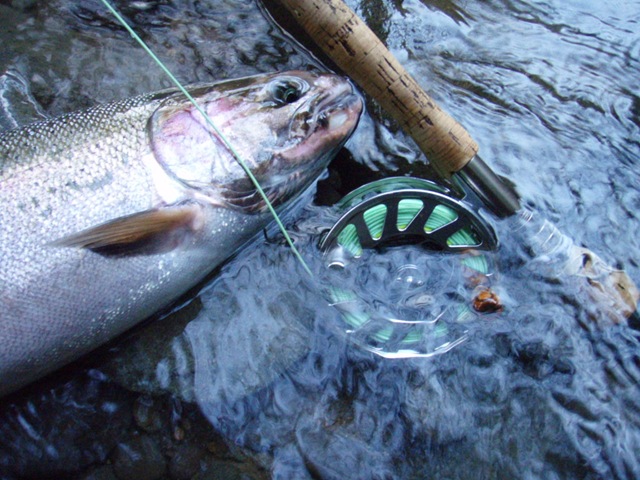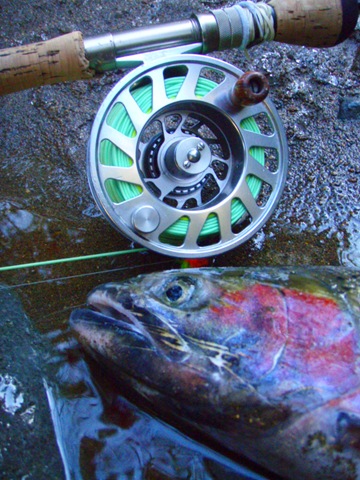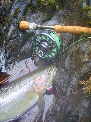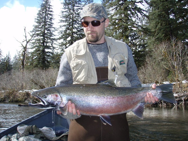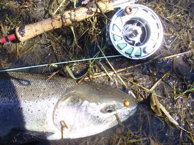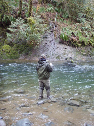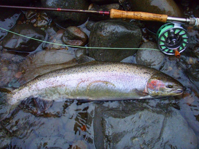 Well the lake fishing went to the wind real quick. I was able to get in the water on Saturday morning, and get into 5 fish, (All Bows). Then the wind kicked up, and blew us off the lake. That was it for me! I knew there were Steelhead in Oregon, and I wanted to get back to them. So today, I was on the creek nice and early. First cast of the day was nice little hen. Not more than ten minutes later, another nice little hen. I was able to get into another 7 fish, and land 2 more. It was not to bad, but I am hoping this week will get real good. Also congratulations to Taylor, for getting his first Steelhead on a fly rod today, it was a real nice fight, and a real nice first fish. Here are the pics from today.