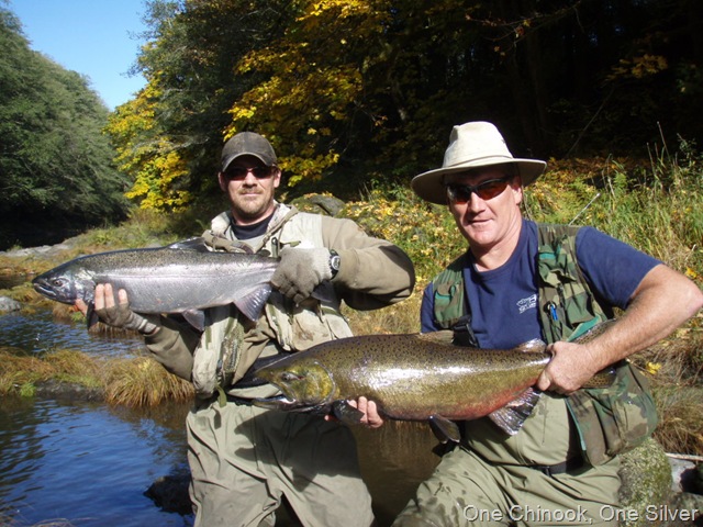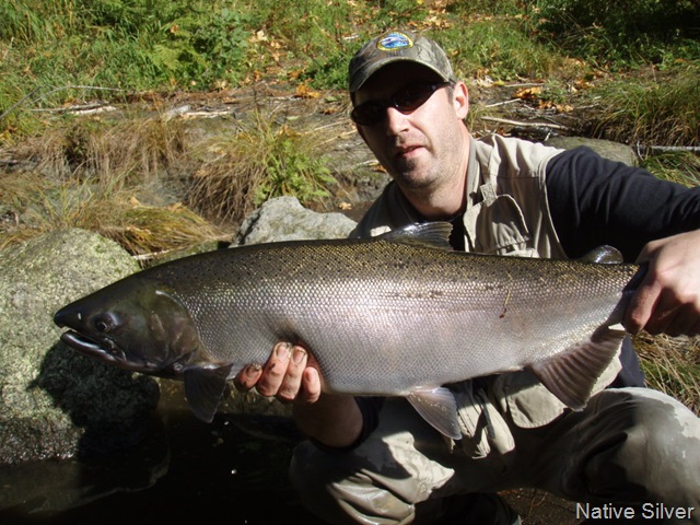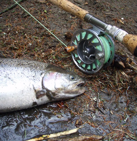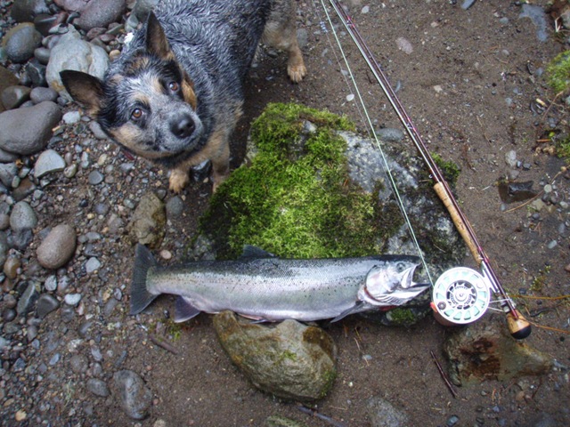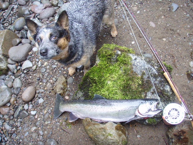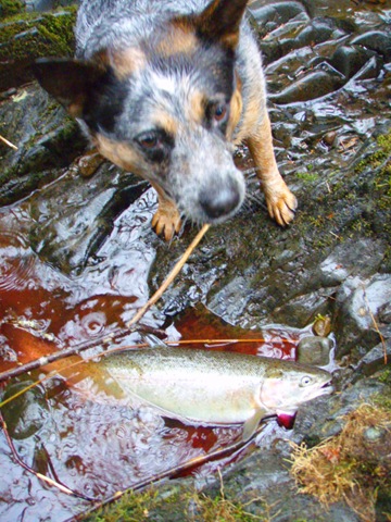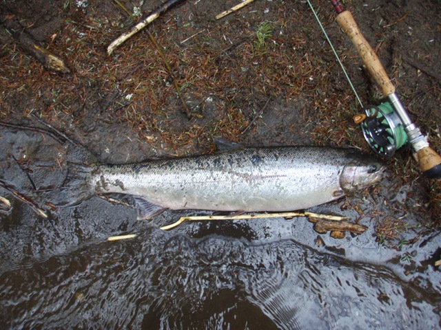 Today was a great day for fishing on the creek. The water level has risen a bit from the recent rains, but the clarity and flow is still in good shape. I would almost go as far as to say, that the fish are now arriving in good numbers. I saw nearly 20 fish today, and was able to hook up with lucky number 13. These fish today were hot!!!. They kicked my butt up and down the creek. I hooked up with three females that went about 15 LBS each. They tore me up!!. I was able to get two of them to the bank, but not to the hand. All 3 of these fish took me down stream nearly a quarter mile. If I had a camera guy today, wow what a video that would have been. If anybody out there would be willing to follow me with a video camera one day soon, I would be more that grateful. It’s not an easy job filming on this creek, but I think the video would be exceptional. Anyway, all 3 of these big fish jumped no less than three times each, the last one must have come out of the water 8 times, while tearing line off my reel, and not stopping for anything. I was able to land 2 fish today, but all the rest just ripped me apart. I was done fishing and worn out by 11:00 today. I am hoping to hold out a bit longer tomorrow, and land some of these big girls, so I can get the pictures going again. Here are the two I got in today. By the way, everyone can thank Indy “My dog†for losing one of the big ones today. She jumped right on it and popped the hook as I was reaching down to get a hand on it. Oh well, got love her anyway.