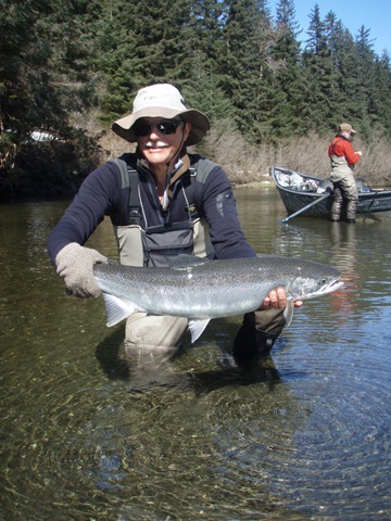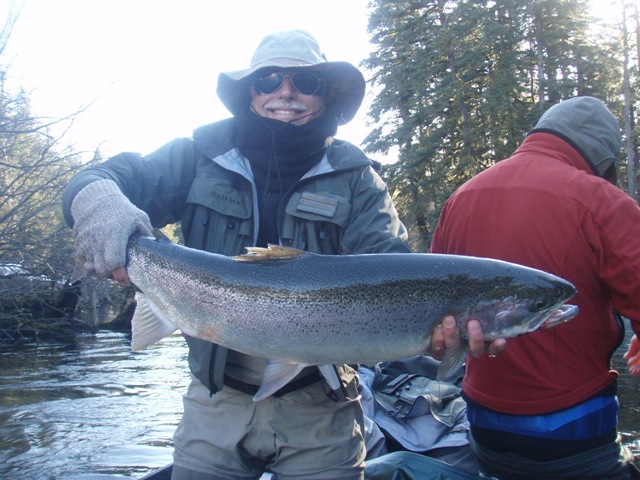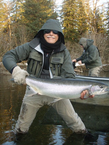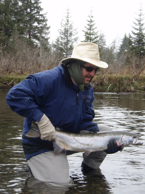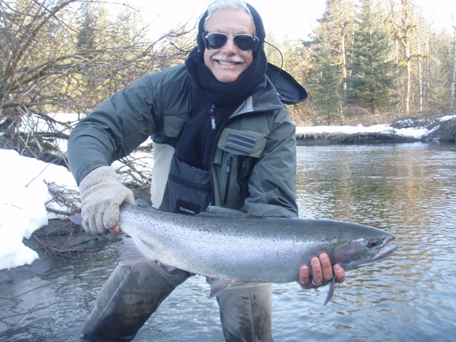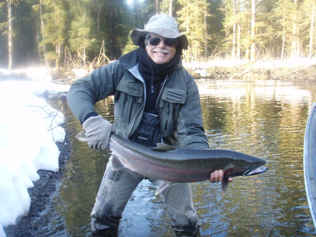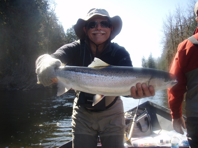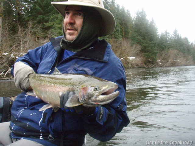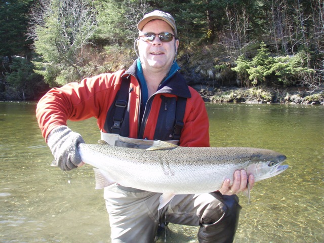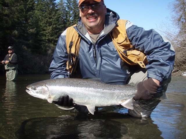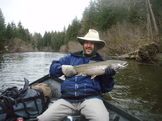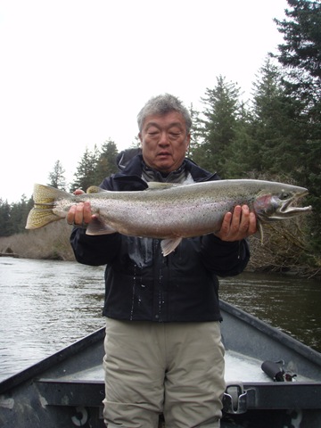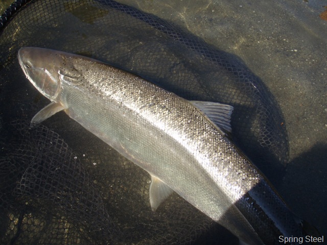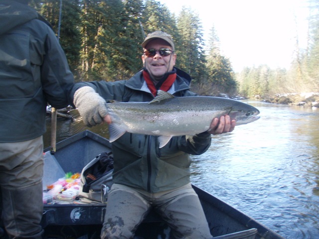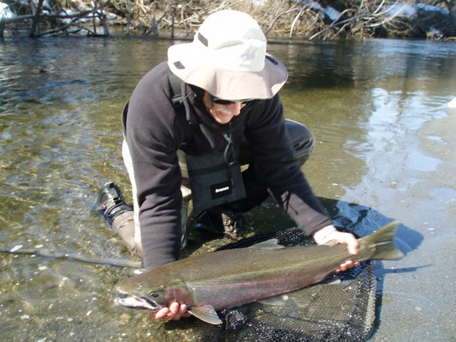 Today was the slowest start of the season so far. We fished the top half of the river real hard today, with no strikes at all. The water was real cold this morning, and the fish were not on the bite. By the time we got half way down, I was worried that we were not going to get a fish today. We kept at it hard, until we hit the 3 mile mark, and then it happened. We rolled onto a nice group of fish laying up under a tree. When we came upon them, they shot out from the tree, and went into a nice little run perfect for fishing. We got into 6 fish here, with none to the boat. After this pod ran dry, we headed to the clay bank hole, and it happened again. This time we hit into another 6 fish, but this time we got one to the boat. This was Dave’s first Steelhead ever. After fighting with 5 of these beauties, he was able to bring one to the boat. A nice spring fish, with a great fight in it. Here is the pic from today, and also another underwater vid for you fish porn lovers. See ya all tomorrow.