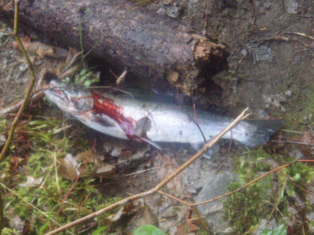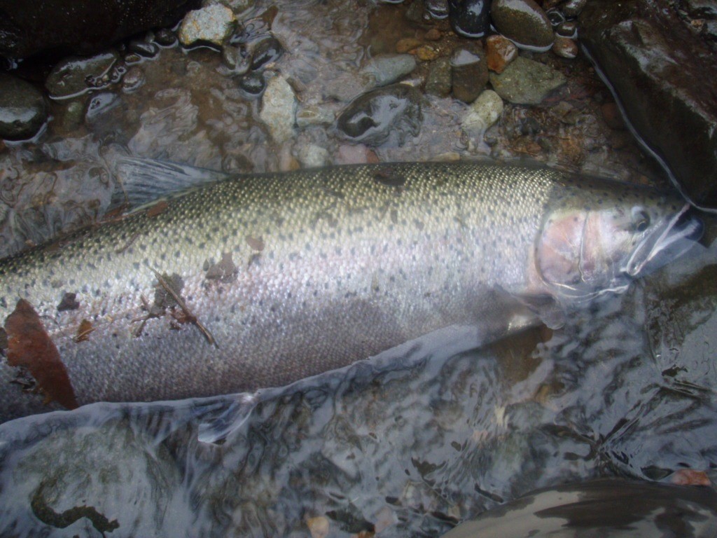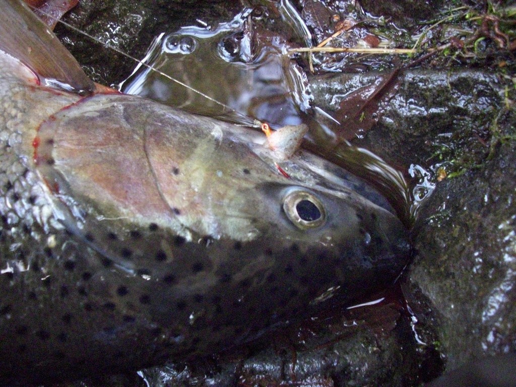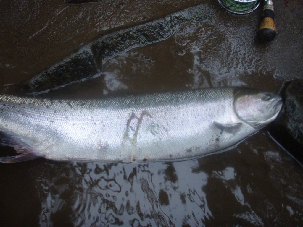 Today was one of those days. The fishing has slowed down a bit the last couple of days, but we are still hammering out a few here and there. I met up with a couple of my fishing partners today, and we hit the creek running. I was hooked up and landed in the first 20 minutes. Damon also hooked up, but was unable to secure the button. The next fish I hooked into, leapt from the water and promptly spit my hook out. Then as if to say, “Screw youâ€, it ran right at me and jumped again, spraying me with water. Then again about a minute later, he came up and rolled again in the slot, then disappeared out of site. Richard was the next to hook up, and he landed a nice bright hen. The fishing slowed to a crawl at this point. An hour or more of time passed before Damon was able to hook up and land a nice hen himself. Damon and I were able to each hook up again in the same hole, but were not able to land another. As Damon and his dad said goodbye for the day, (Because Richard fell in the river), I headed back up for another look, and a chance to tag out for the day. Well, I got lucky and landed a nice buck with just a bit of color.