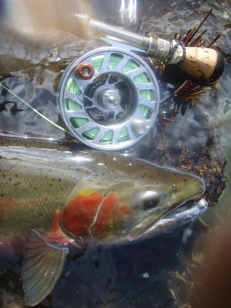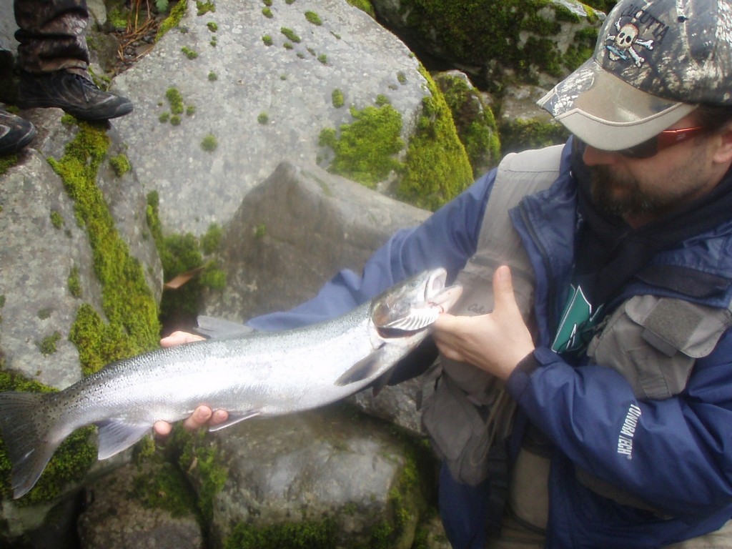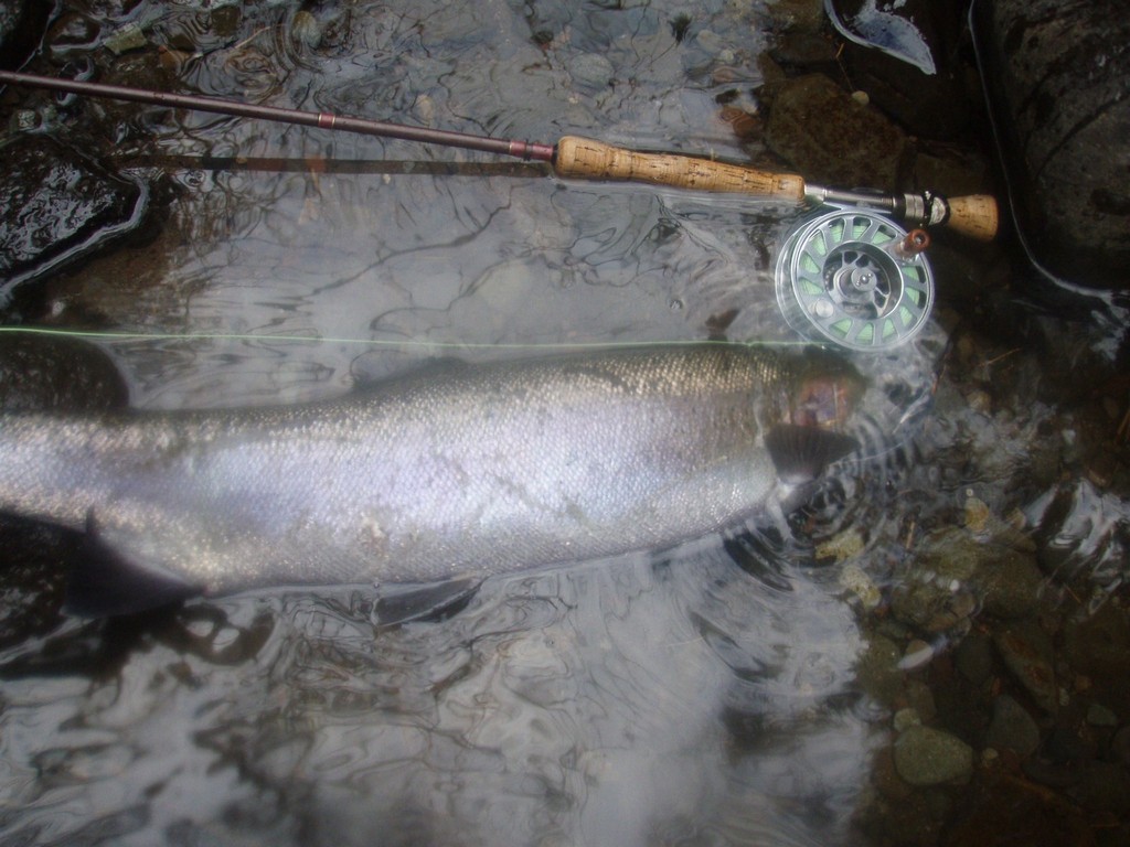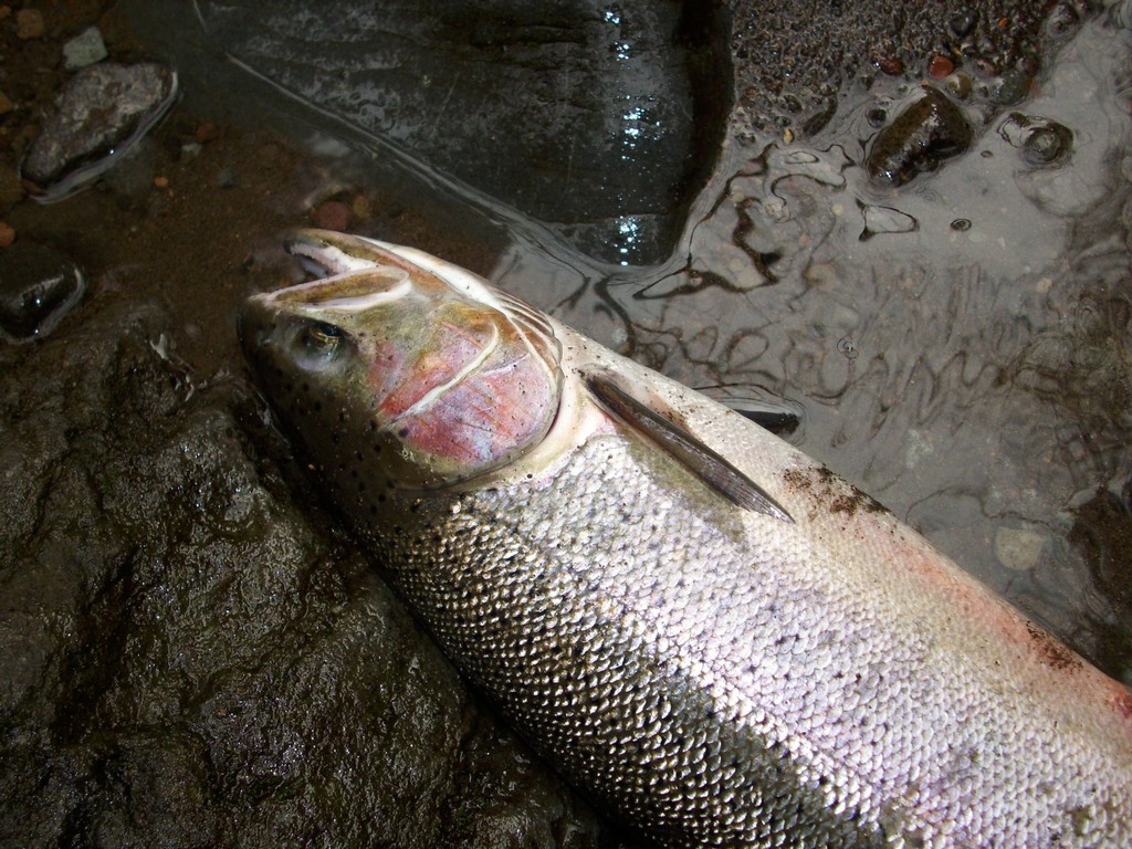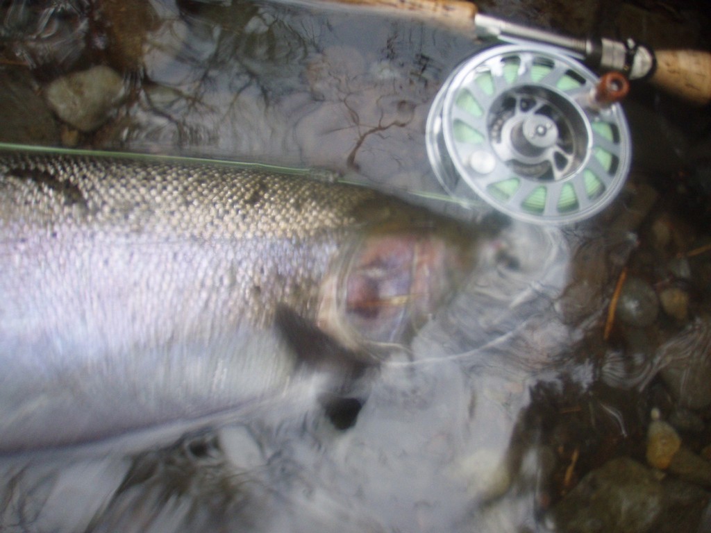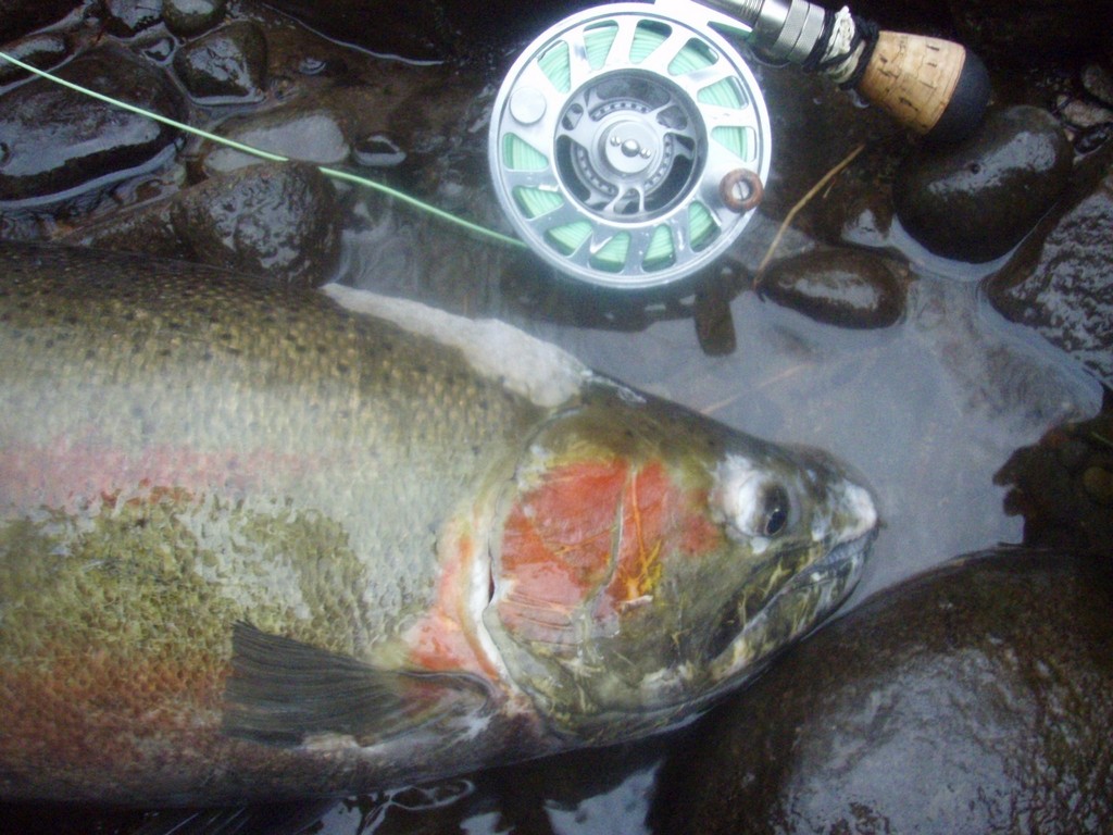 I don’t know when it will end, but I hope it just keeps on going. I know at this point, the fish are turning color, and the meat is not at it’s best, but for someone who does not eat them, they are still fighting fish. For the last 30 years, I have taken some flak for fishing after all the bright ones are gone, but I say to them “Who cares, they still bite, and they still fight!†I have seen and landed several very nice fish this last week, (some egg wagons with the skeen’s still in act and great meat for those that want it). The males may have color on them, but if they are still firm and not to badly beat up, the meat will still be in great shape, they just don’t look as good to the neighbors when you bring it out for the barbecue. Anyway, the fish are still moving in. Today, Matt and I saw nearly 20 fish, got into 12, and landed 4. At certain times today we had up to 8 fish in 2 different holes, with new fish moving in throughout the day. Weather has been fabulous, but it is leading to real low water conditions, causing the fish to be more spooking after the morning shade goes away. Most of the fish are laying in tight little riffles behind rocks, but we did find fish moving through the bigger holes today. At least 5 of the fish we saw today, were 12 to 15 pound chrome bright egg wagons, working there way up quickly. We could not even keep up enough to get one cast at these fish. “They were on the move!â€. Here are the pics from today, and I am trying to put together a good vid, but youtube is messing up with the music I can use. Hope to have it up soon!.