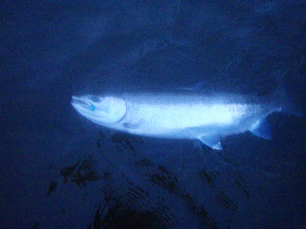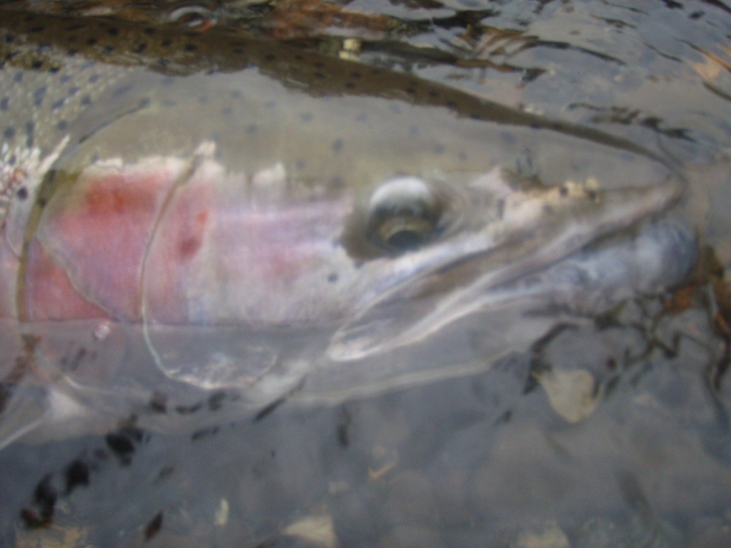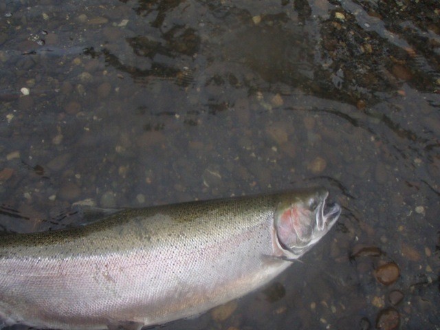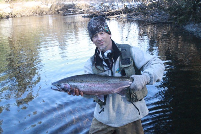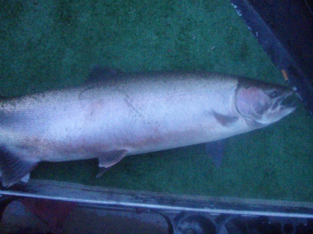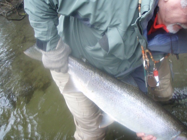 Well I am back at home again amongst the Steelhead I have grown to love so much. Had to work throughout the day, but I was able to mess with some fish tonight. I tried the mouth of the river first, but no movement at all. I ran into a friend of mine, that told me about some fish up behind a log that I have often fished behind, so I headed up to them. He had hooked up with two of them, so I knew there were some biters left behind for me. I found them quickly, and at first I was so excited I could not do anything correct. First I hooked myself, then my dog, then wrapped up around a branch and had to re-rig. So you would think this would end at this point, but not today. I re-rigged a total of three times before I got it together. One reason I will use as an excuse, is that I was perched on an icy log that had 0 traction. With one foot on a stub, and the other one slipping back and forth, I was not in the most stable place to be, but it was the only good action on the fish. There were around 30 fish in this run, and after the entire fiasco of the first 20 minutes, I was hooked up with a real nice 6 pound chromer. Soon after I hooked up again, and lost this one, about a 10 pounder. I was able to hook up and play with 8 of these beauties, and brought 3 to the camera. From where I was fishing the pics are all of fish at my feet below the log, so no good ones on the bank. There are three fish all together, but they all look alike from this angle, so hopefully they are ok to view. The light was also going away, so they are slightly dark.