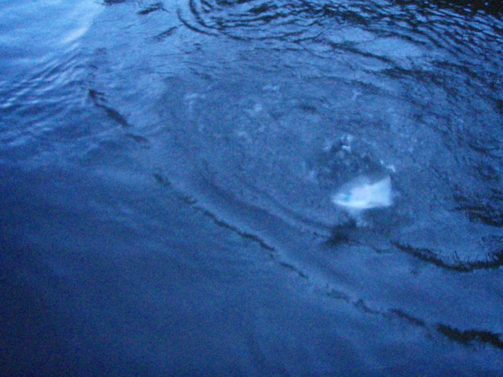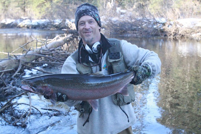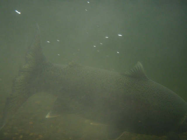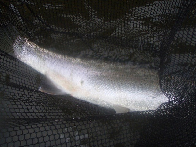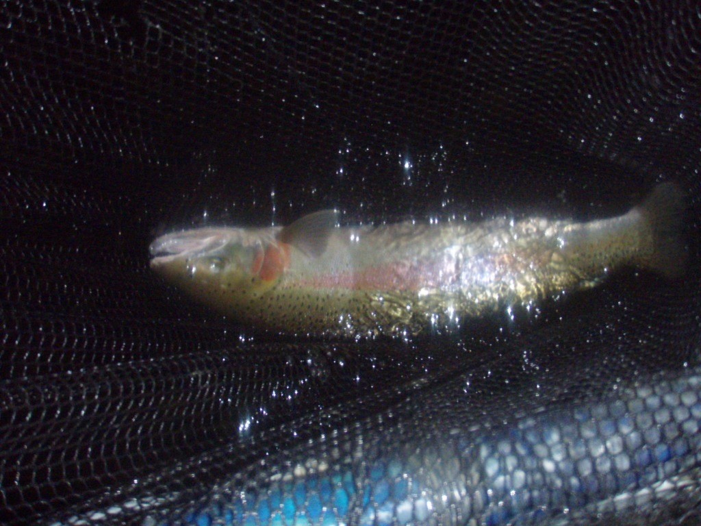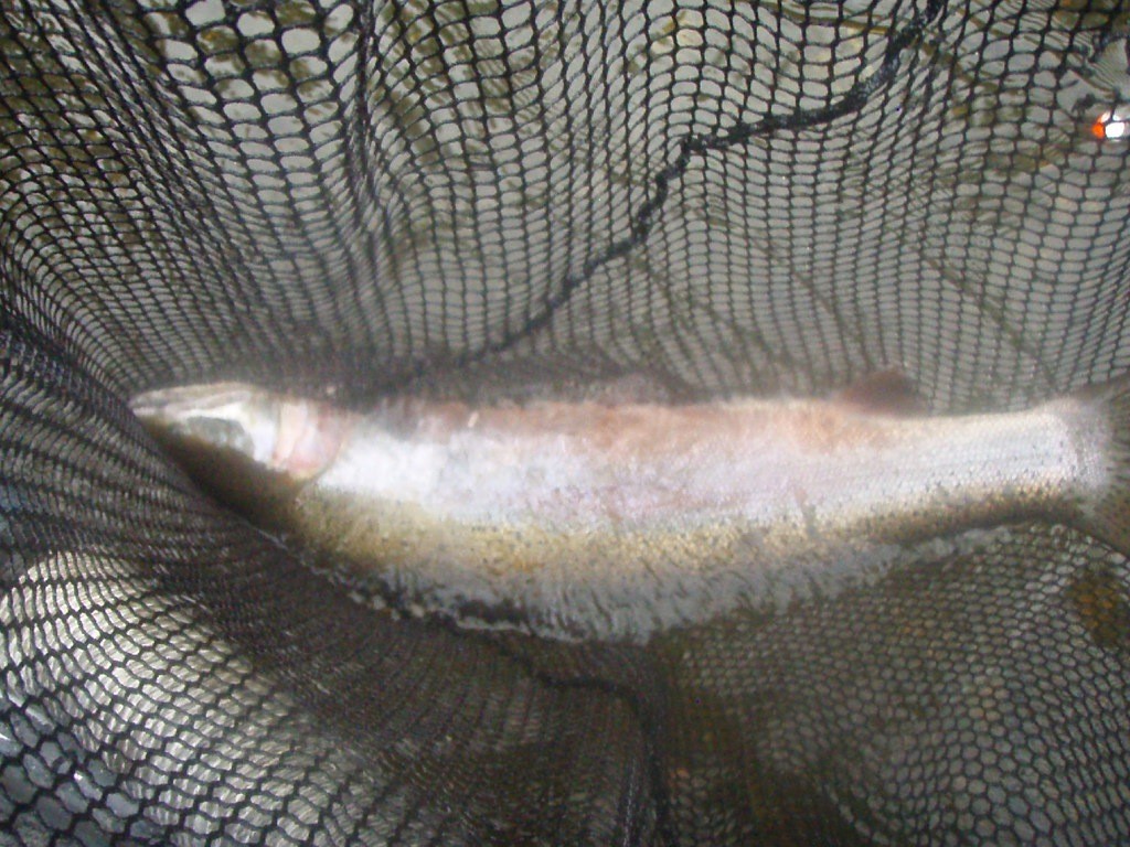 Well I am back at home again amongst the Steelhead I have grown to love so much. Had to work throughout the day, but I was able to mess with some fish tonight. I tried the mouth of the river first, but no movement at all. I ran into a friend of mine, that told me about some fish up behind a log that I have often fished behind, so I headed up to them. He had hooked up with two of them, so I knew there were some biters left behind for me. I found them quickly, and at first I was so excited I could not do anything correct. First I hooked myself, then my dog, then wrapped up around a branch and had to re-rig. So you would think this would end at this point, but not today. I re-rigged a total of three times before I got it together. One reason I will use as an excuse, is that I was perched on an icy log that had 0 traction. With one foot on a stub, and the other one slipping back and forth, I was not in the most stable place to be, but it was the only good action on the fish. There were around 30 fish in this run, and after the entire fiasco of the first 20 minutes, I was hooked up with a real nice 6 pound chromer. Soon after I hooked up again, and lost this one, about a 10 pounder. I was able to hook up and play with 8 of these beauties, and brought 3 to the camera. From where I was fishing the pics are all of fish at my feet below the log, so no good ones on the bank. There are three fish all together, but they all look alike from this angle, so hopefully they are ok to view. The light was also going away, so they are slightly dark.