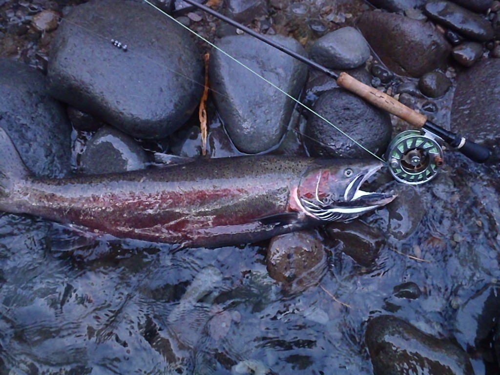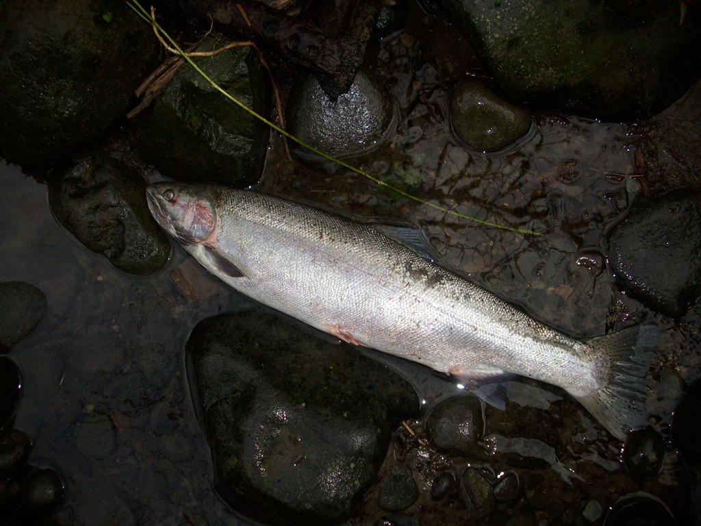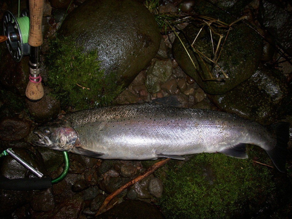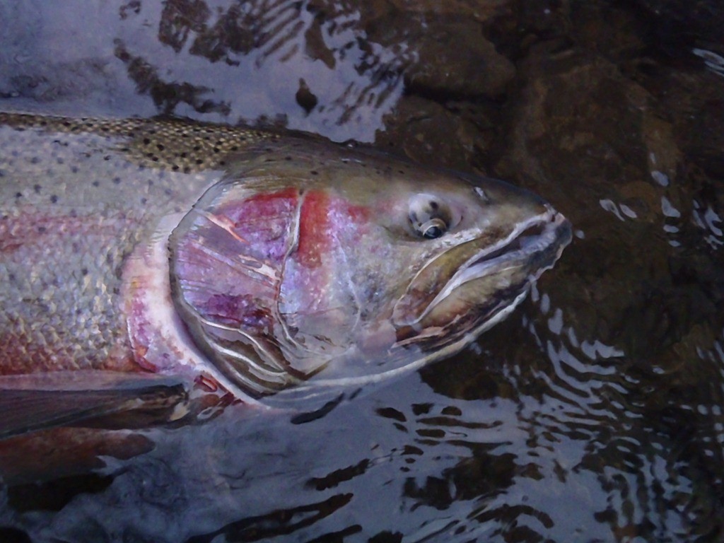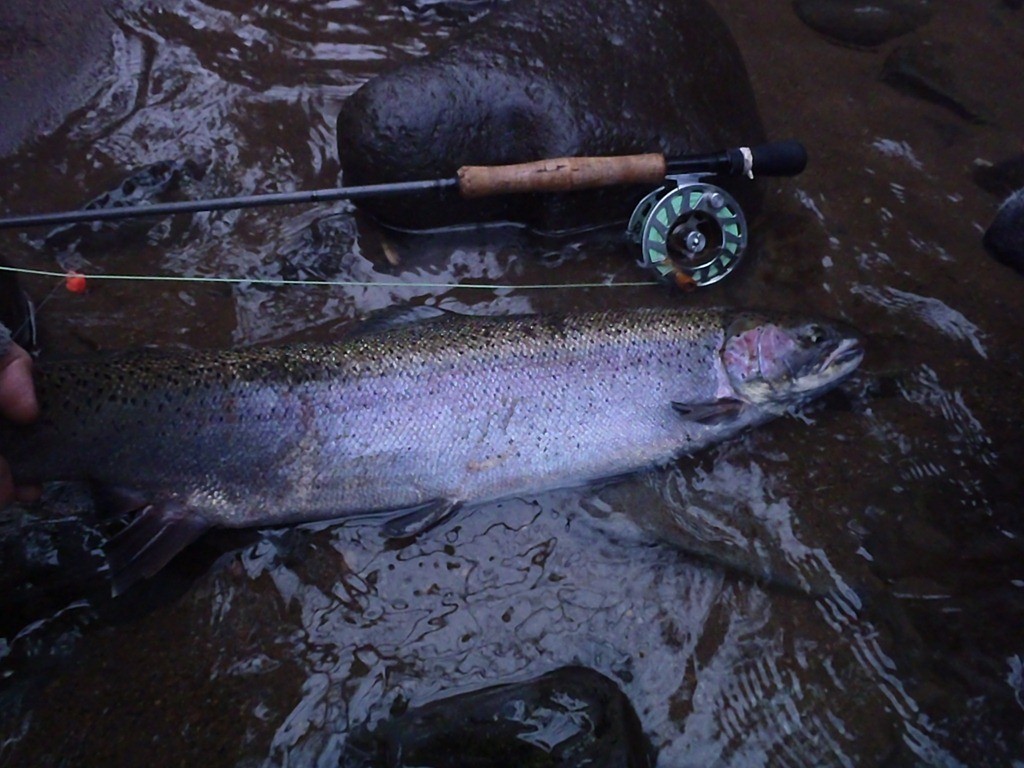 As we are all aware of here in the area, there was some major flooding the last couple of days. Well I went out today to see my favorite creek, and to witness the destruction. I will try to explane it the best I can for those that know this area. The top slot had two trees that had recently fallen across the river, “They are gone and no where in siteâ€. We had a big cedar tree come down last year, and it is also gone down river. The cedar tree had caused the water to run around the outside of what we call the “Log holeâ€. Well that is not the case now, with the cedar tree now jammed in below the log hole and above the birthday hole, the water is now running on the inside again and the log hole should be back to somewhat normal flows. With the cedar tree now below the log hole, this will make it a challenge to land any big boys that run on down. Now the big log that was across the river at the top of the log hole, “The log that created the log hole†is gone down river a half mile and has dug in just above the table top hole. It is about three feet out of the water and is not in the way at all. Good place for this log to end up. So from what I saw today, without being able see the bottom at all. I would say that this may have cleaned up the creek for the best as of now. Hope it all turns out as good as it looks. I went to the hatchery and the doors are now open, so the fish are going to go on in and the count now begins. Let’s all cross our fingers and pray the fish don’t all run up and in in the next three days like they did 4 years ago.