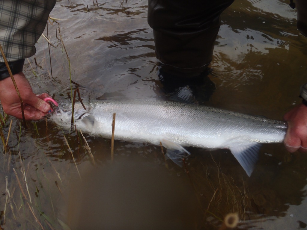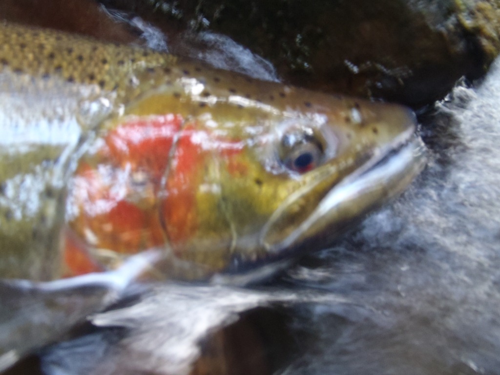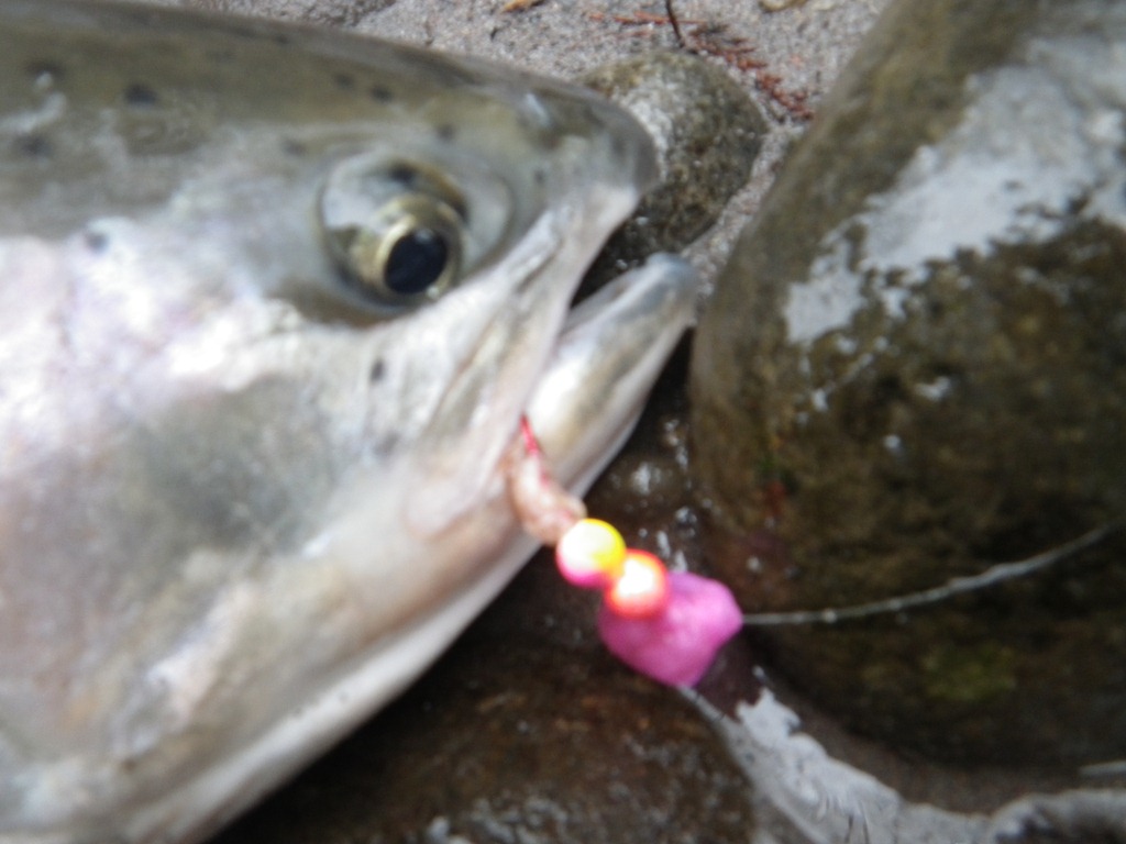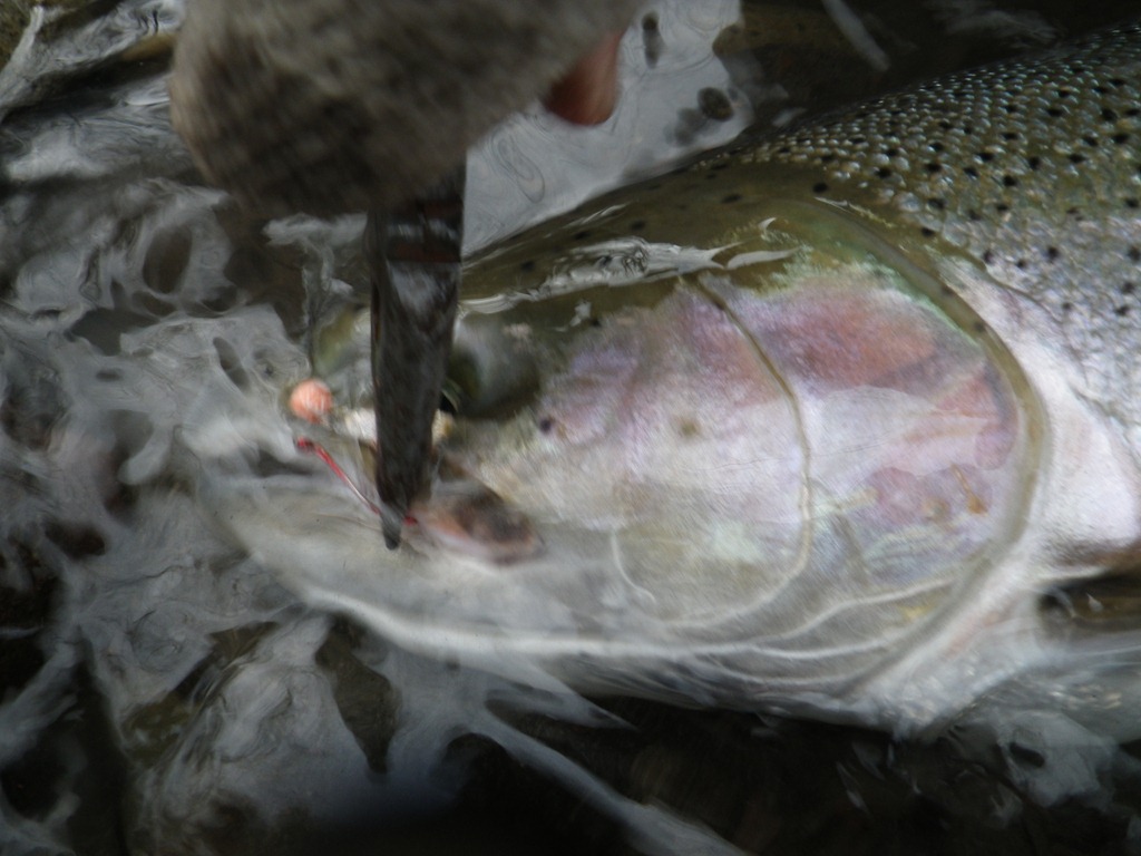 Today though I had a chance a a great trip with a great guide on the Sandy river (Ed Fast). We started out at Revenue bridge and headed down towards Dodge. Along the way, we saw fish darting out of tail outs and from behind boulders like crazy during certain times during the day. Ed said the water was low and clearer than most times during the year, giving us that uncommon ability to see these beautiful fish in there natural areas. My buddy Ian accompanied us along the way also, and is also a great guy to spend the day with on the water. We headed down a couple miles before wetting our gear and hooking up. As Ed and Ian fished and area known to produce fish, I headed down to a drift I have not fished for nearly 20 years. To my surprise it was nearly the same as it was before. As I fished it I notice up river that Ed was landing a nice little hatch buck #1. During my hour or so of time in this one slot, I was able to hook up 3 fish, but lost all due to using to light of leader. After some time, Ed and Ian came down in the raft to join me in the drift. I was able to hook up and again loose another. I then switched to 10 Lb test instead of the 6 I was using. This made the difference since the next fish I hooked was a 10 to 12 pounds native buck that put up one hell of a fight. The Ian took the reins and landed a great little hatch fish. I don’t remember who hooked up next after that, but it was non stop for some time that’s for sure. The total of the day as best I can figure was 6 for15 or 16. I know I lost 7 fish that I fought or some time. It was a great day on the water.